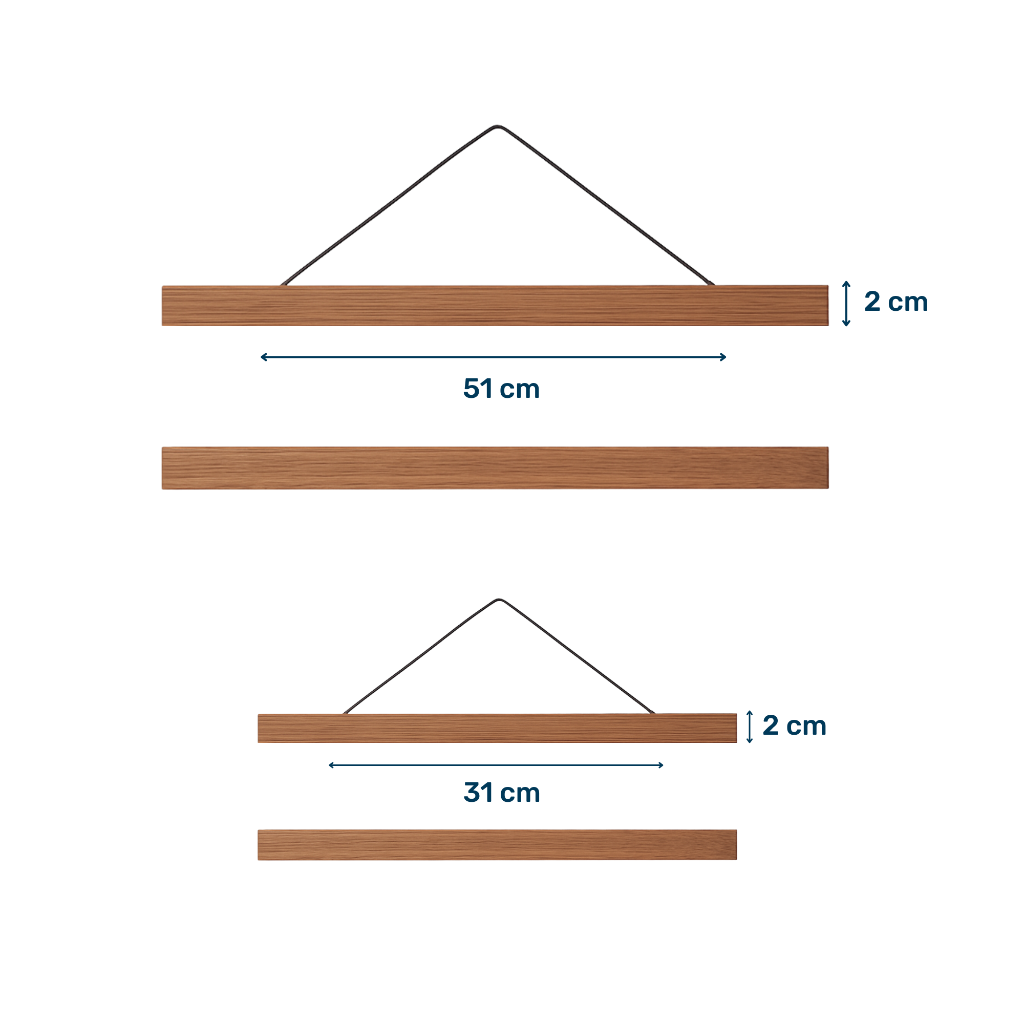 Caractéristiques techniques : • Matériau : bois de pin • Couleurs : marron ou beige • Largeur disponible : - 31 cm (marron) - 51 cm (marron ou beige) • Largeur de la bande : environ 2 cm • Épaisseur du bois : environ 0,7 cm • Composition : 4 bandes de bois avec aimants intégrés • Système de suspension : corde fournie • Fixation : aimants puissants intégrés à l’intérieur des bandes